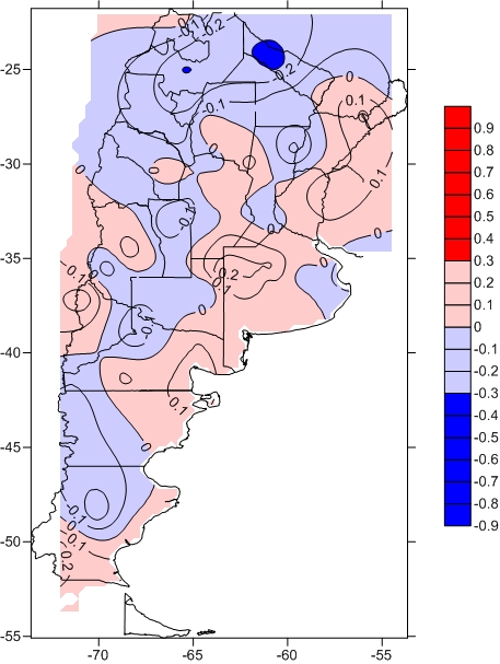 Para poder evaluar la incidencia del anticiclón semipermanente del océano Atlántico Sur sobre la precipitación se posicionó el máximo de altura geopotencial en el Atlántico sur entre el ecuador y 40°S y se registró su valor de intensidad, su latitud y longitud. Luego, se definieron las anomalías de intensidad con el índice AAINT (mgp) para cada mes de cada año del período de estudio 1972-2012. De esta manera, un valor positivo de AAINT implica una intensificación del sistema mientras que un valor negativo representa un debilitamiento. Para calcularlo se utilizaron los datos de altura geopotencial en el nivel de 1000 hPa derivados de los reanálisis ERA-Interim del European Centre for Medium-Range Weather Forecasts (ECMWF) en el océano Atlántico Sur entre el ecuador y 40°S.
