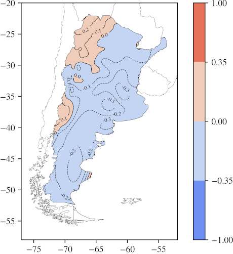 Campo de correlación entre la temperatura de "DEF" y el índice DOI