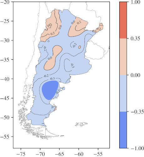 - PDO: con el indicador negativo se podrían esperar temperaturas por encima de lo normal sobre el este de Río Negro y Chubut.